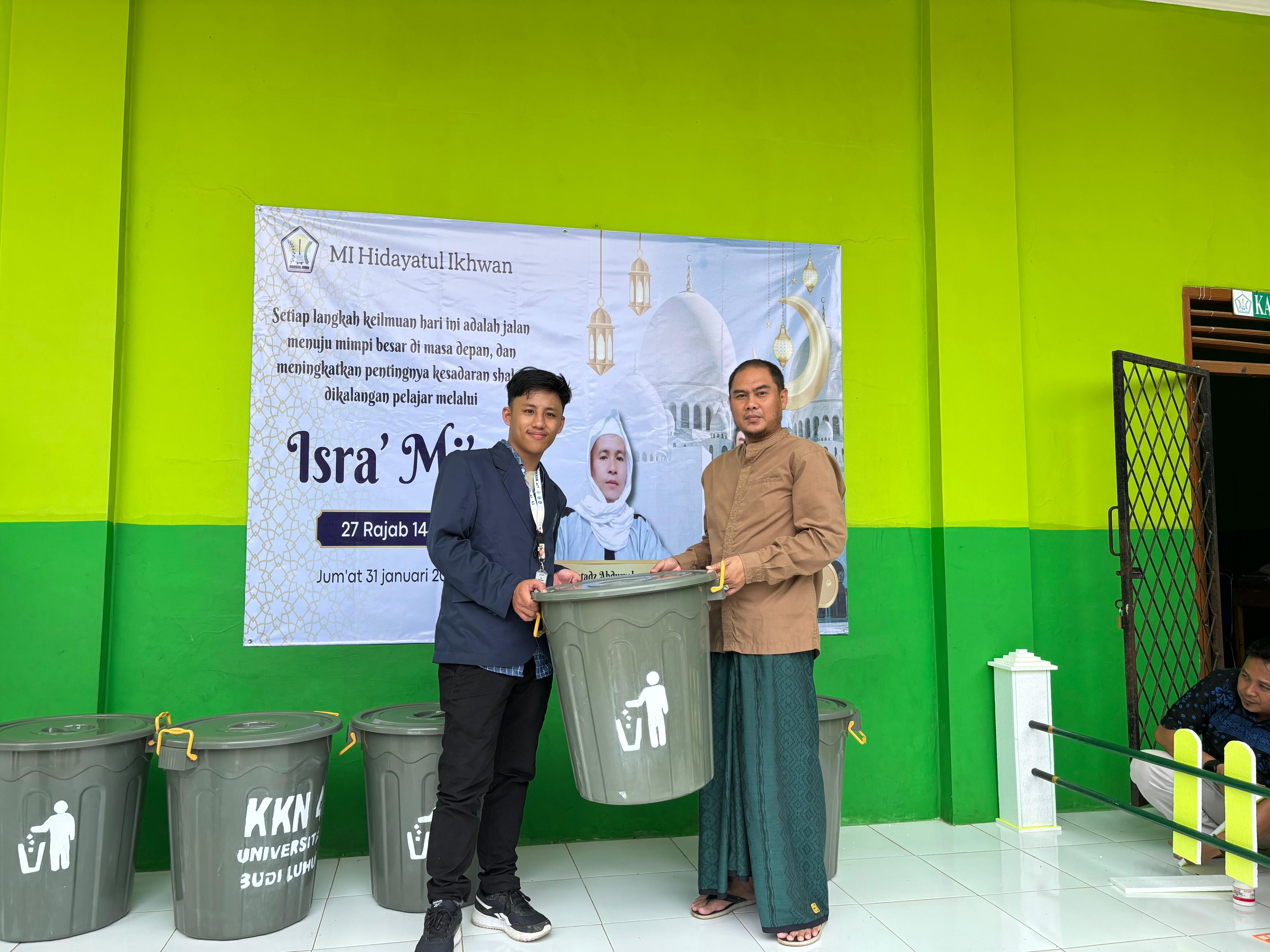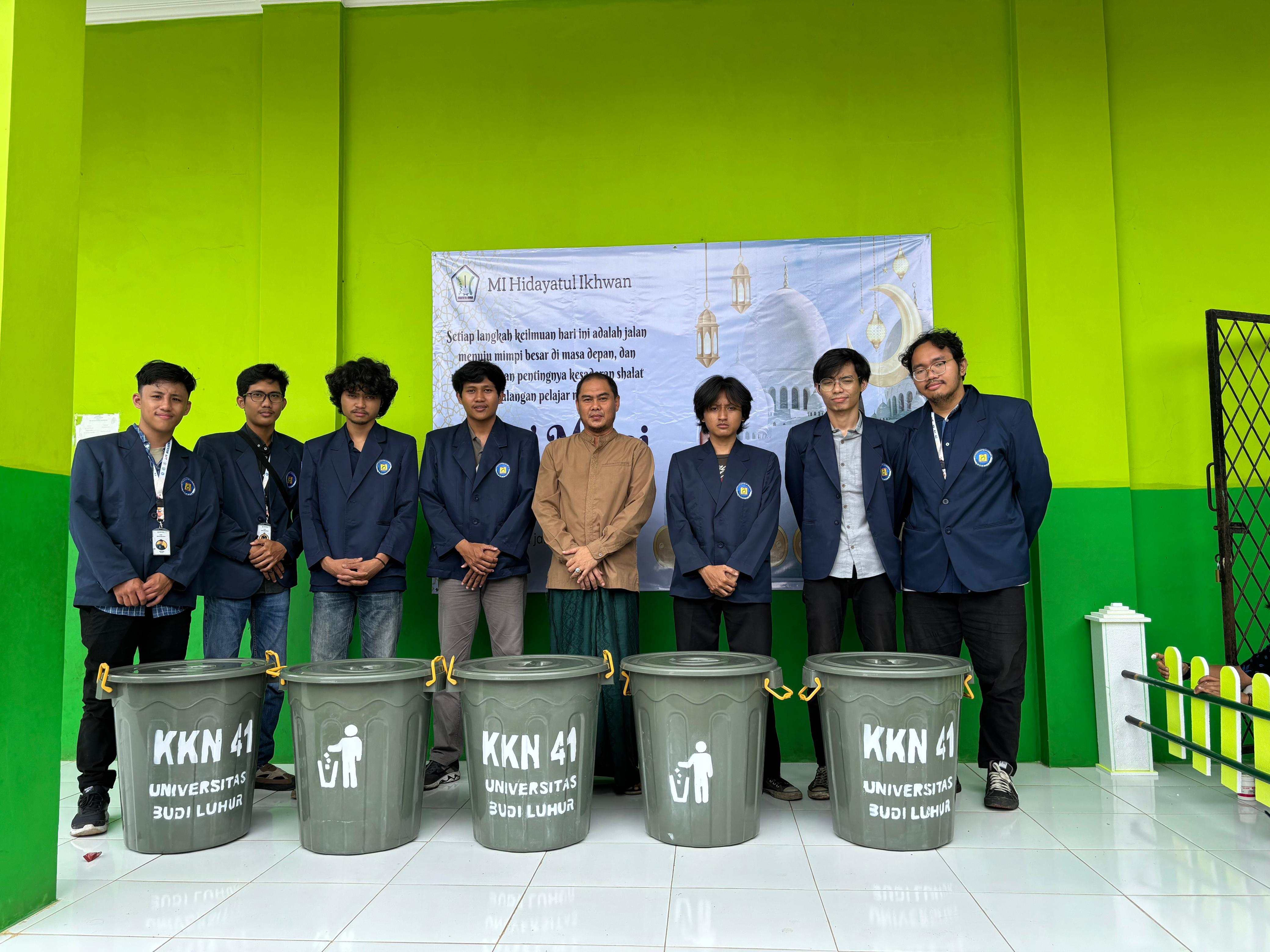 Kelompok KKN 41 membuat tempat sampah dari ember besar berkapasitas 80 liter untuk Madrasah Hidayatul Ikhwan (5 buah) dan PAUD Al Ikhsaniah Madani (2 buah). Pembuatan tempat sampah ini bertujuan untuk mengelola sampah dengan lebih baik di lingkungan sekolah.